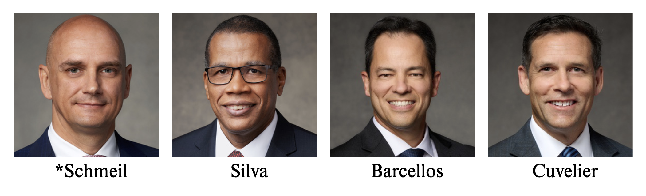 A presidência da Área Brasil para 2026–2027, da esquerda para a direita: élder Ciro Schmeil, presidente; élder Denelson Silva; élder Ronald M. Barcellos; e élder B. Corey Cuvelier.