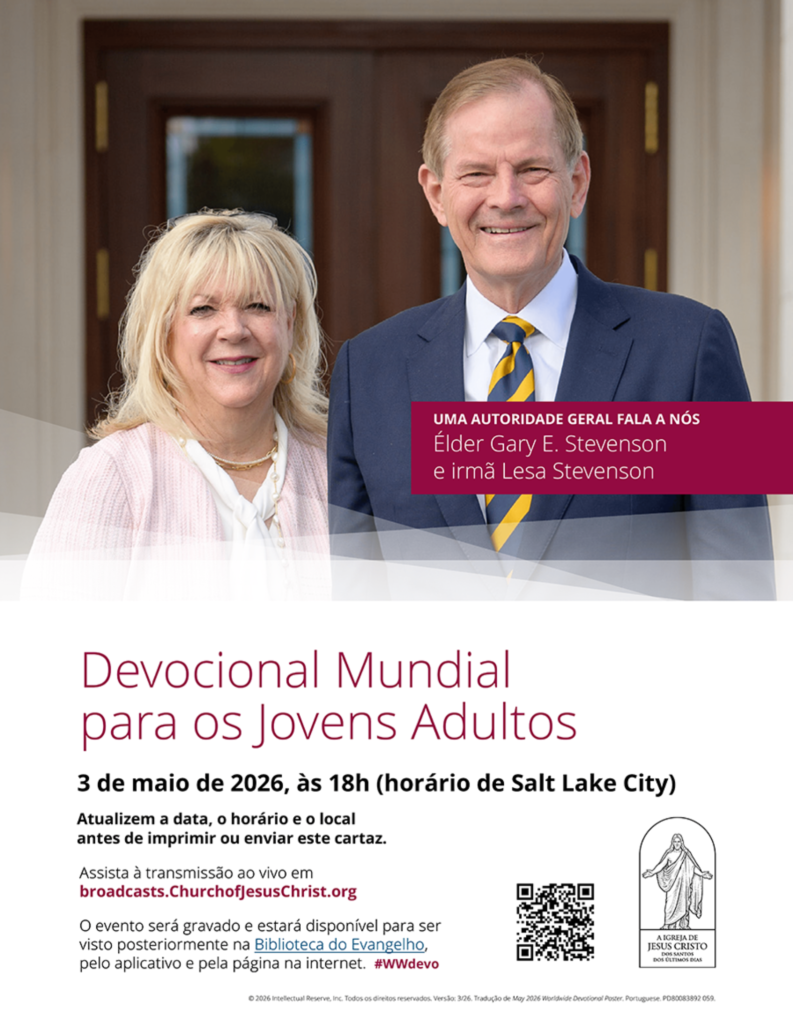 O élder Gary E. Stevenson, do Quórum dos Doze Apóstolos, e sua esposa, Lesa, posam em frente ao Templo de Antofagasta Chile após a dedicação do templo no domingo, dia 15 de junho de 2025. © 2026 by Intellectual Reserve, Inc. All rights reserved.O élder Gary E. Stevenson, do Quórum dos Doze Apóstolos, e sua esposa, Lesa, darão uma mensagem sobre o discipulado por toda a vida aos jovens adultos de A Igreja de Jesus Cristo dos Santos dos Últimos Dias durante uma transmissão do devocional mundial que estará disponível no dia 3 de maio de 2026 nas Américas e no dia 10 de maio em outras áreas.