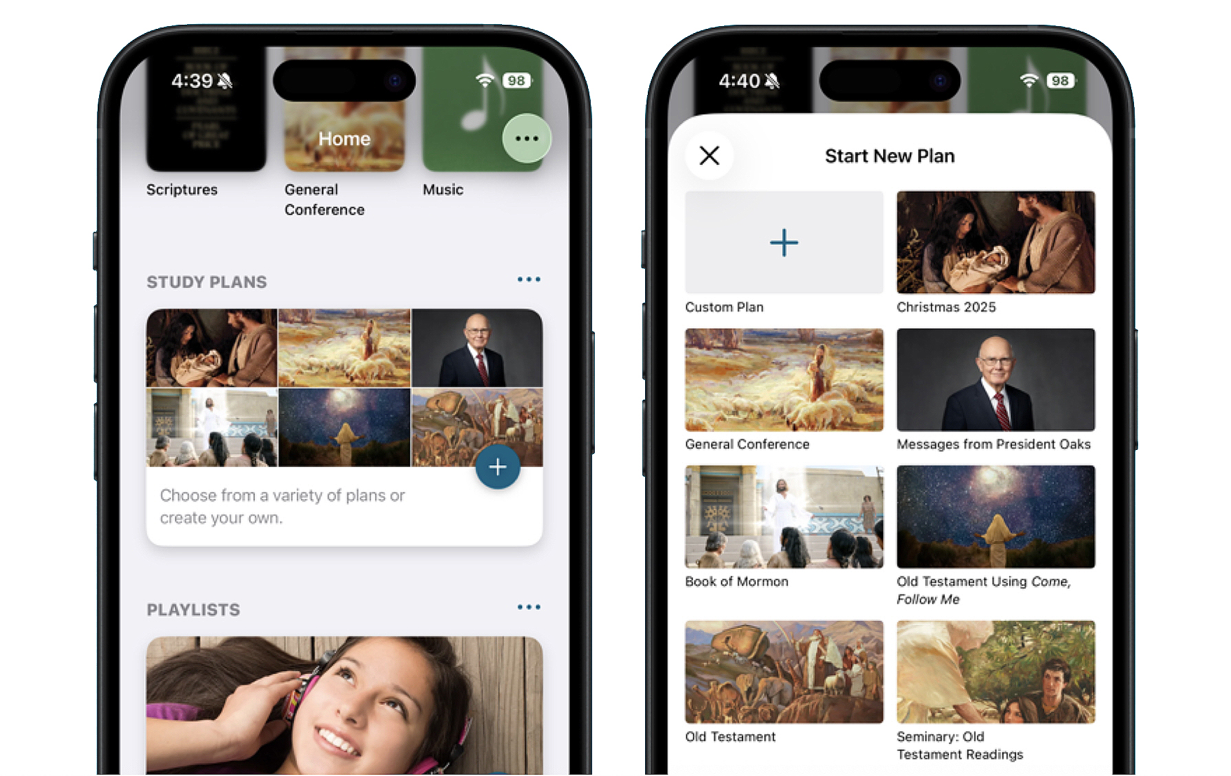 - Planos de estudo: Os planos de estudo na Biblioteca do Evangelho ajudam os usuários a definir um cronograma para estudar qualquer conteúdo no aplicativo. Além de criar planos personalizados, os membros podem usar três planos fornecidos pela Igreja que auxiliam no estudo do Velho Testamento: